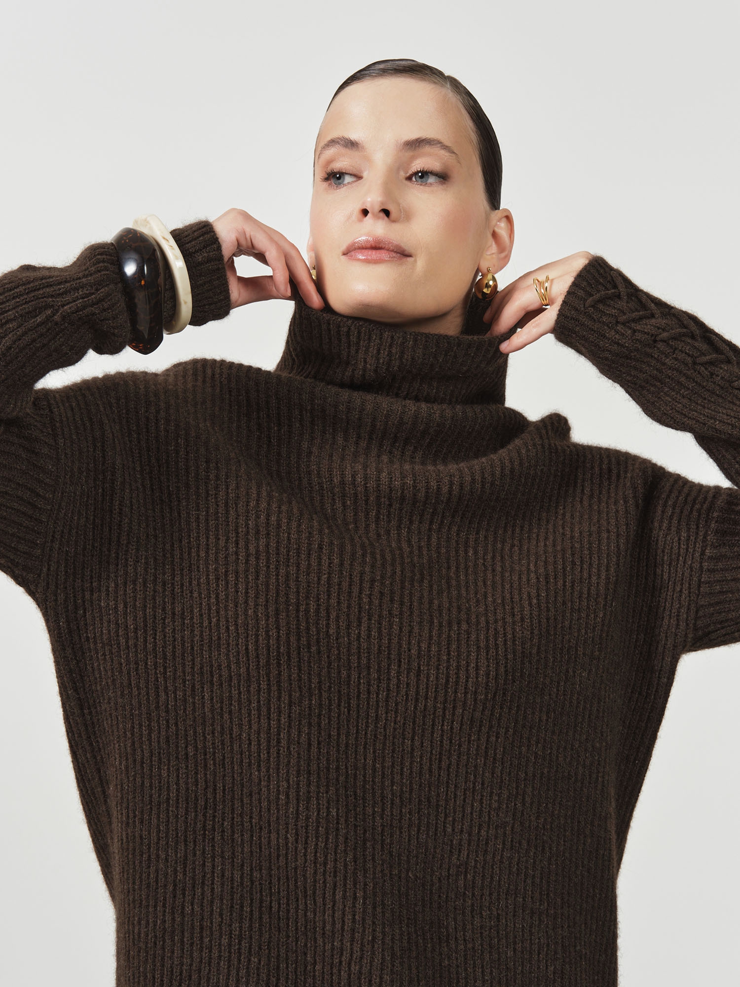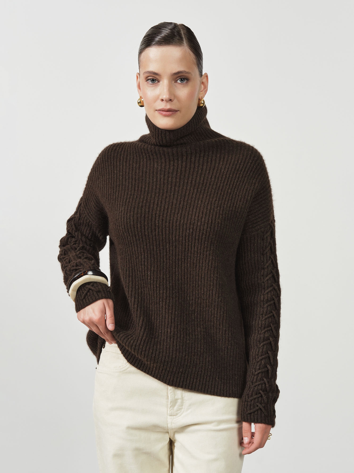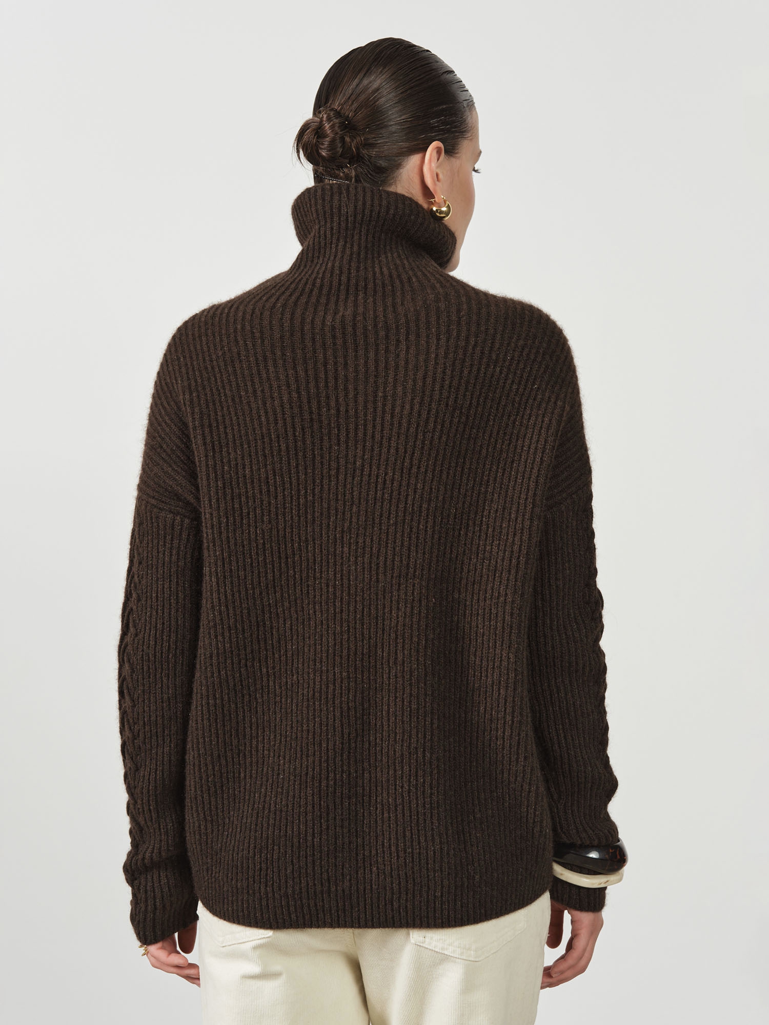 Высокий воротник-стойка, фактурная вязка и декоративные элементы на рукавах создают выразительный и благородный образ.