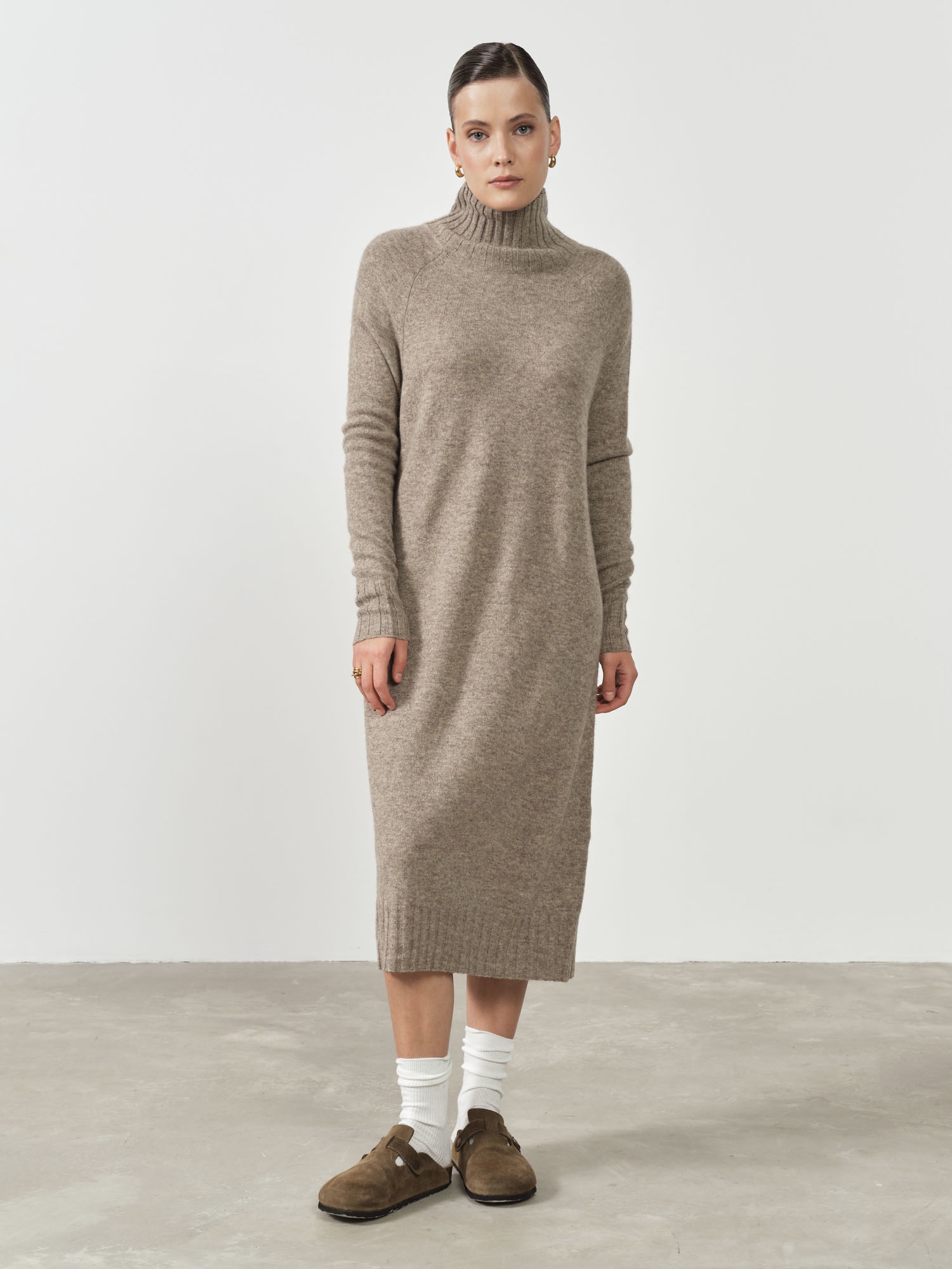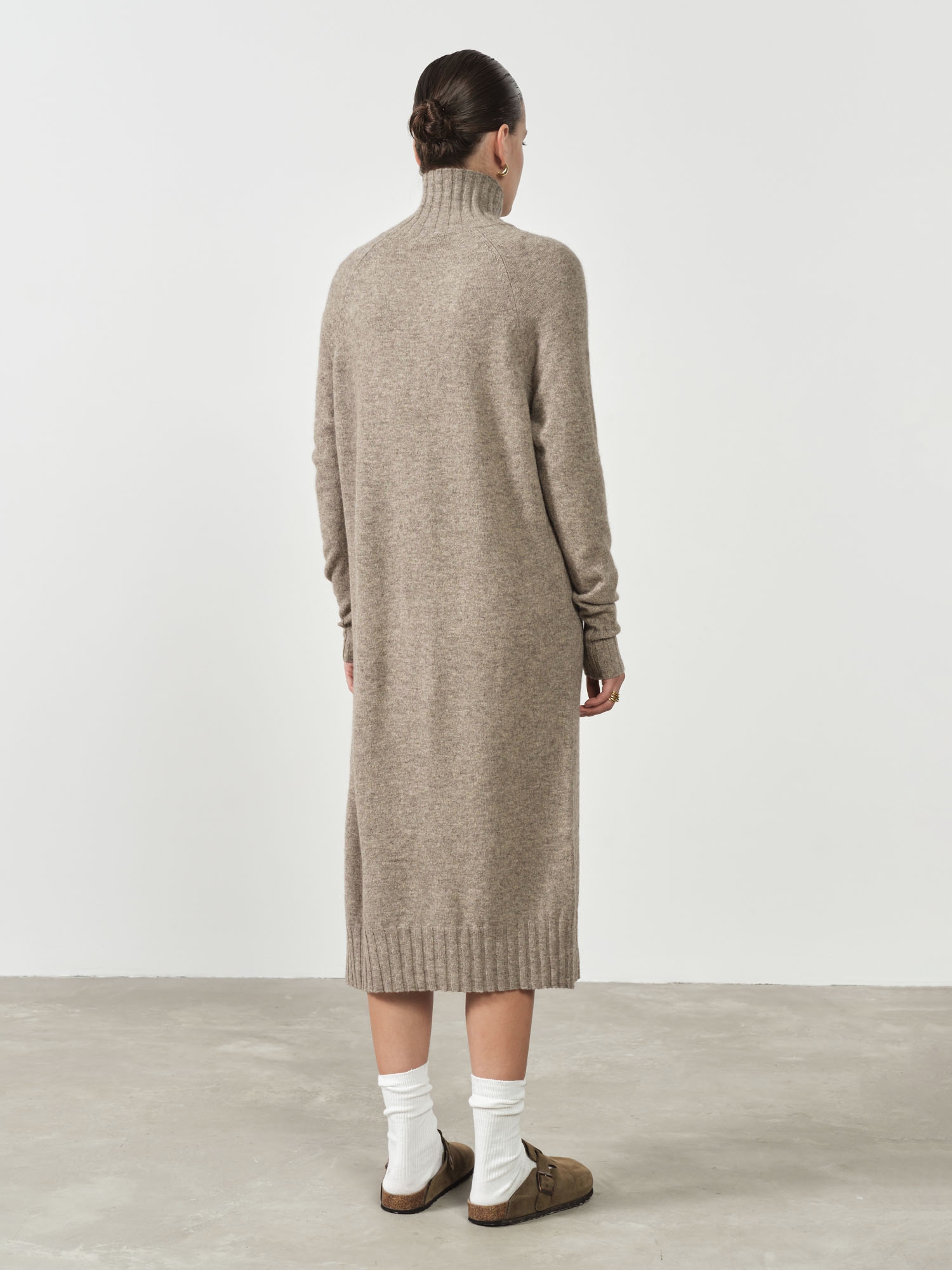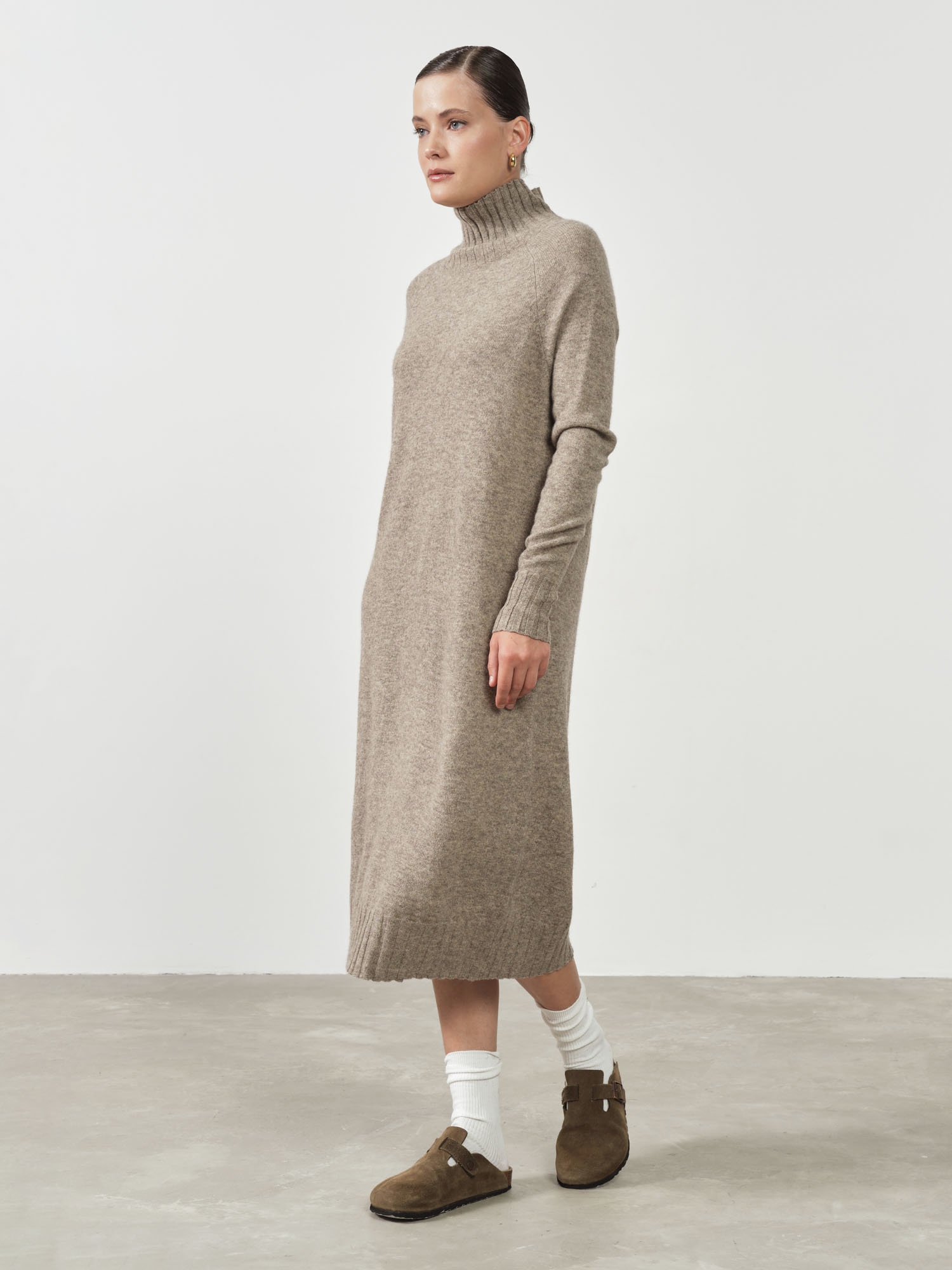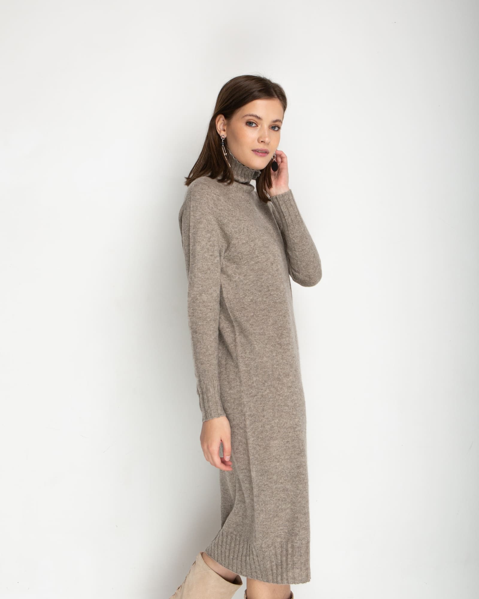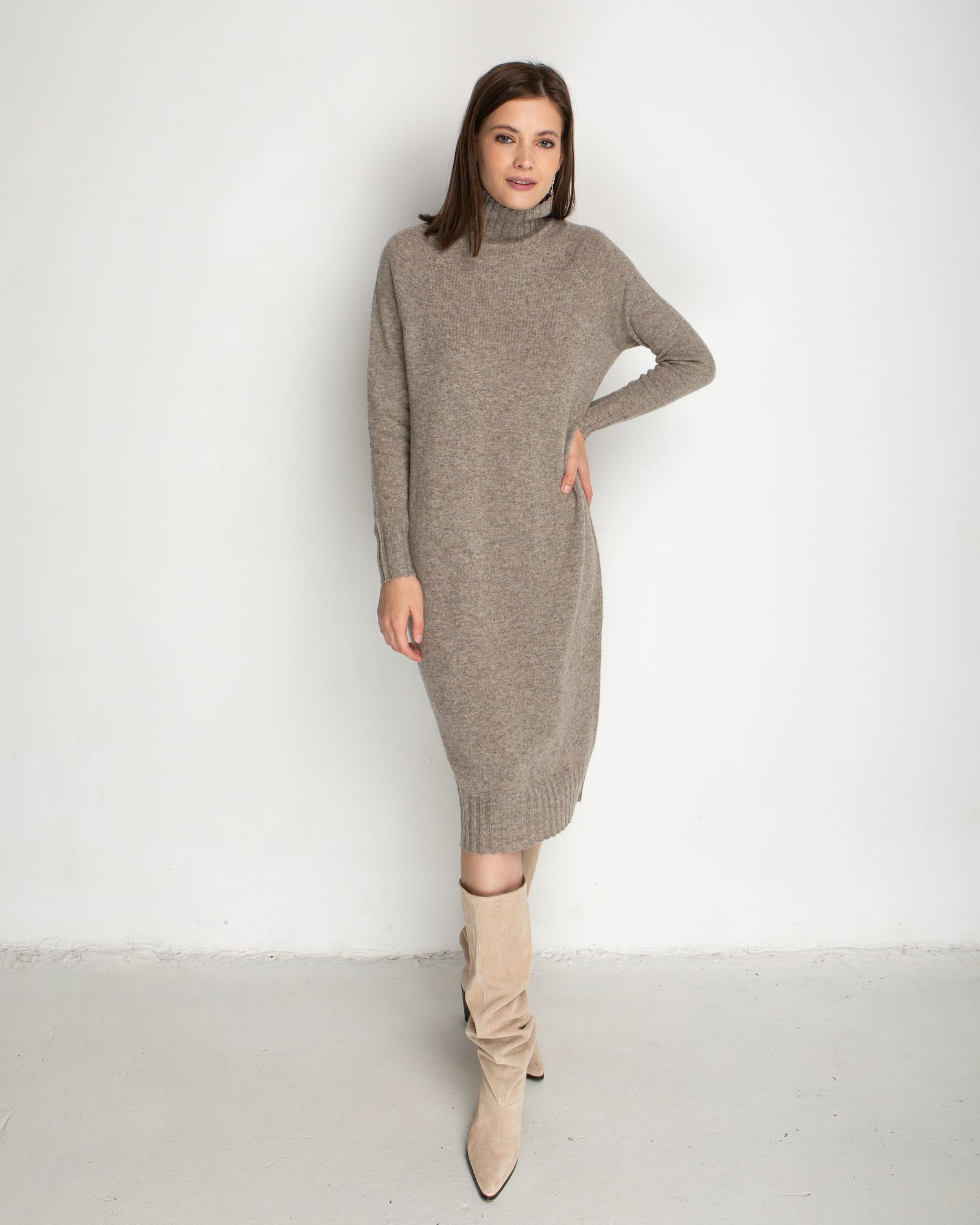 Длинные рукава и свободный крой создают ощущение уюта, а элегантный воротник стойка добавляет образу элегантности и защищает шею от холода. Цвет платья универсален и легко сочетается с разными элементами гардероба, позволяя создавать стильные и теплые образы на каждый день.