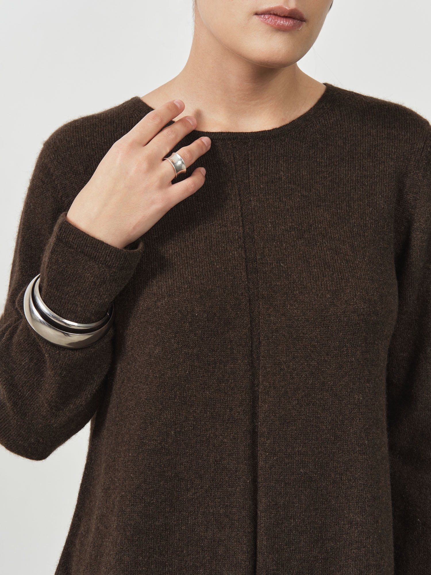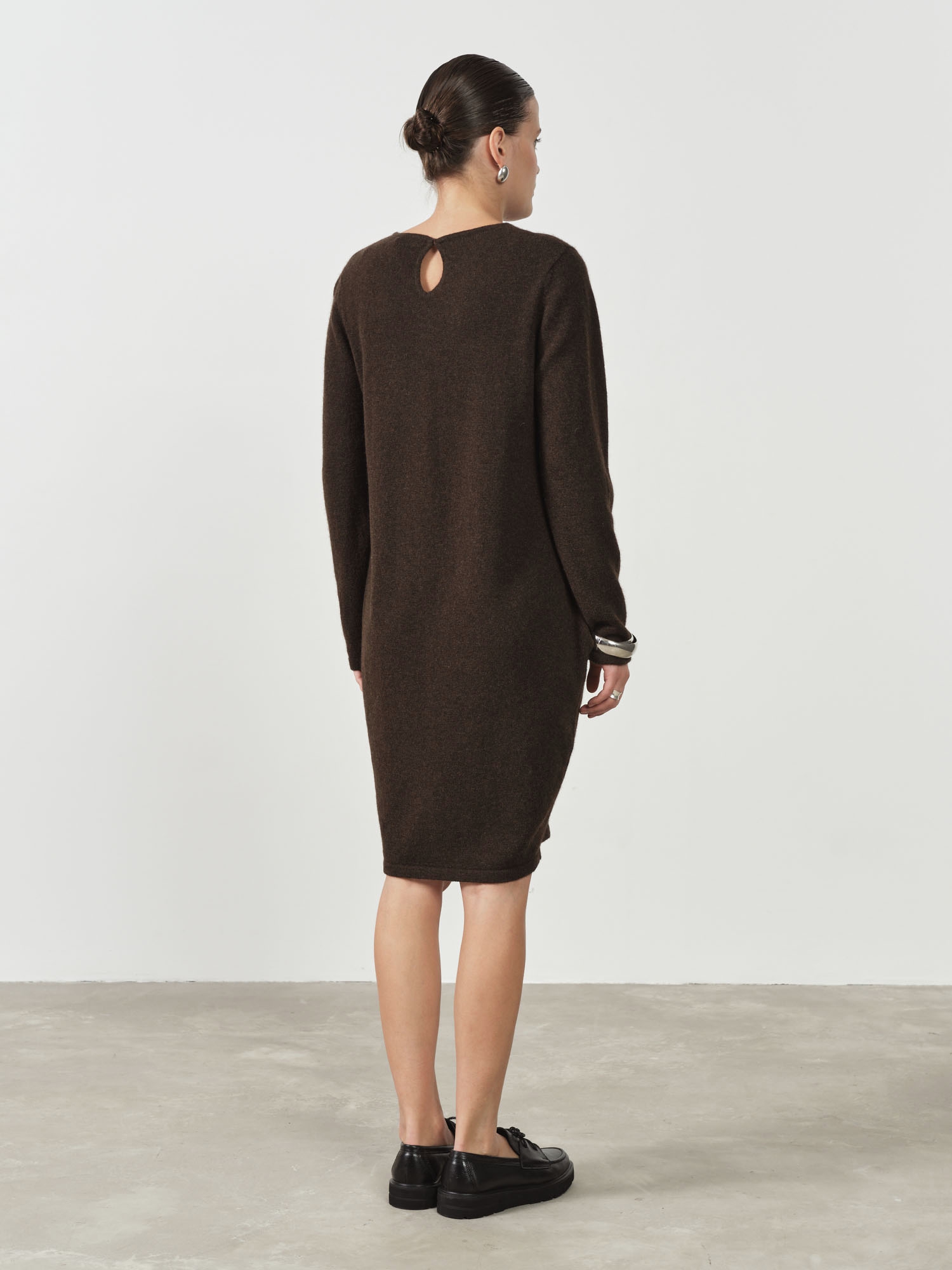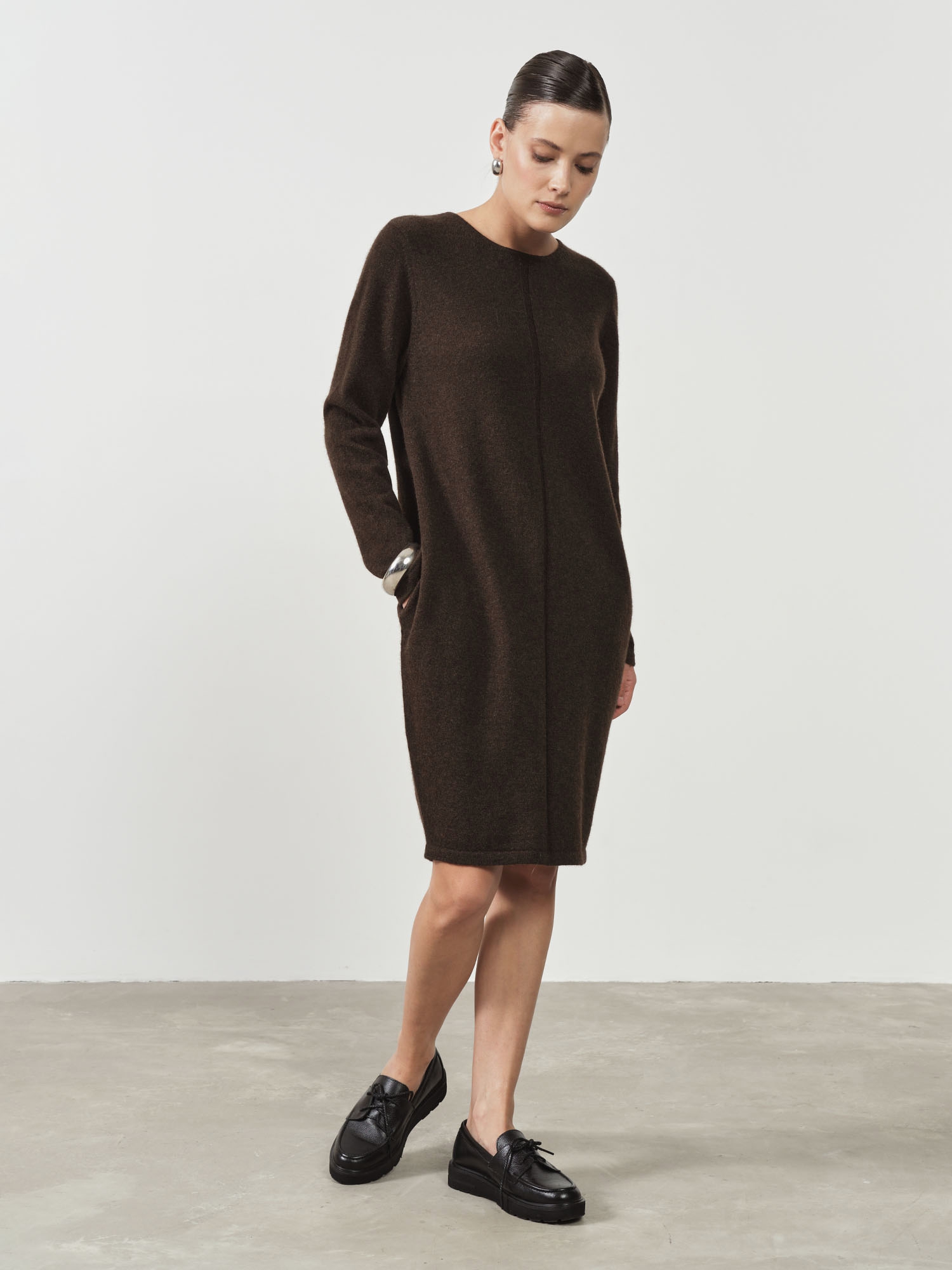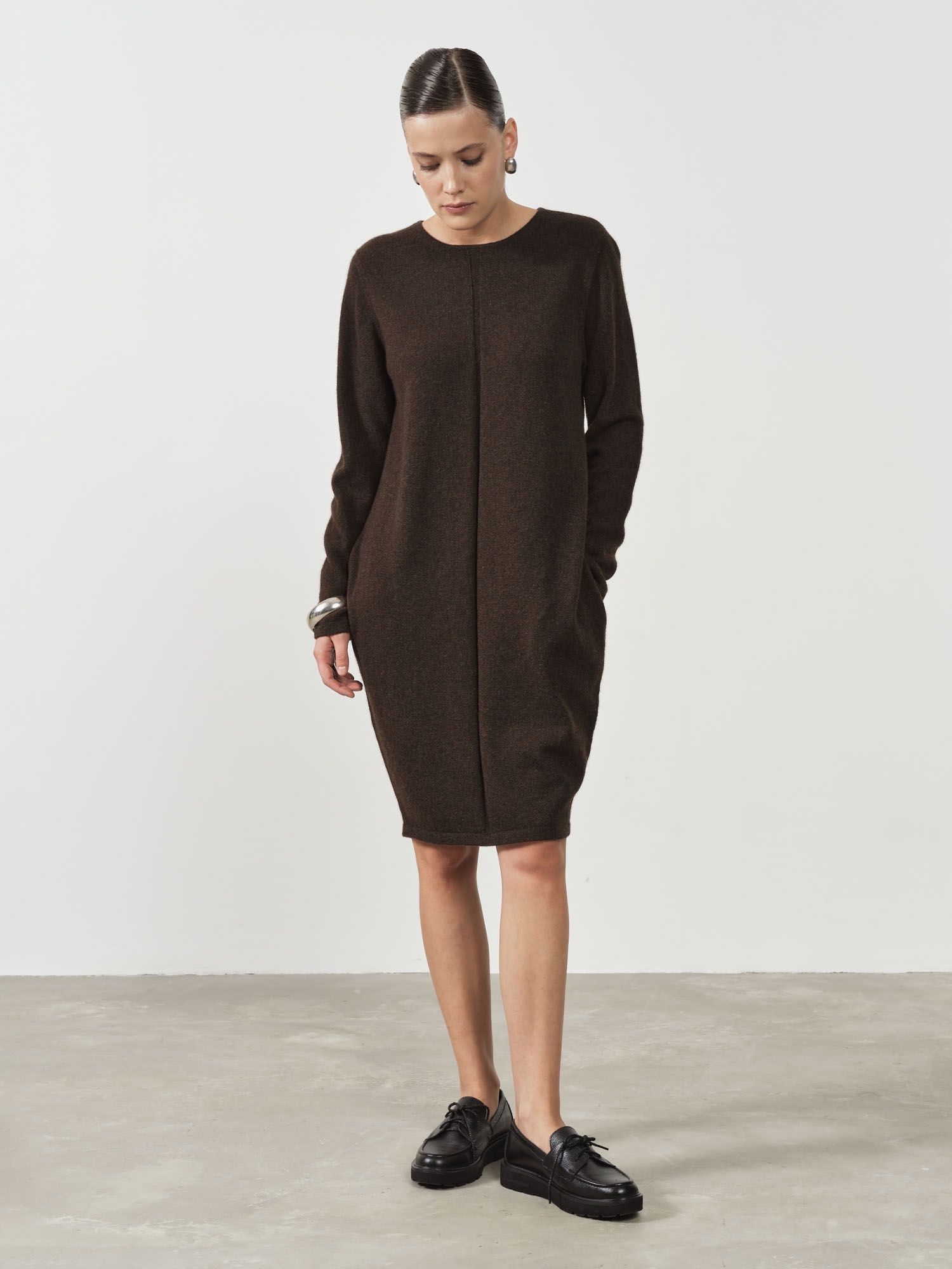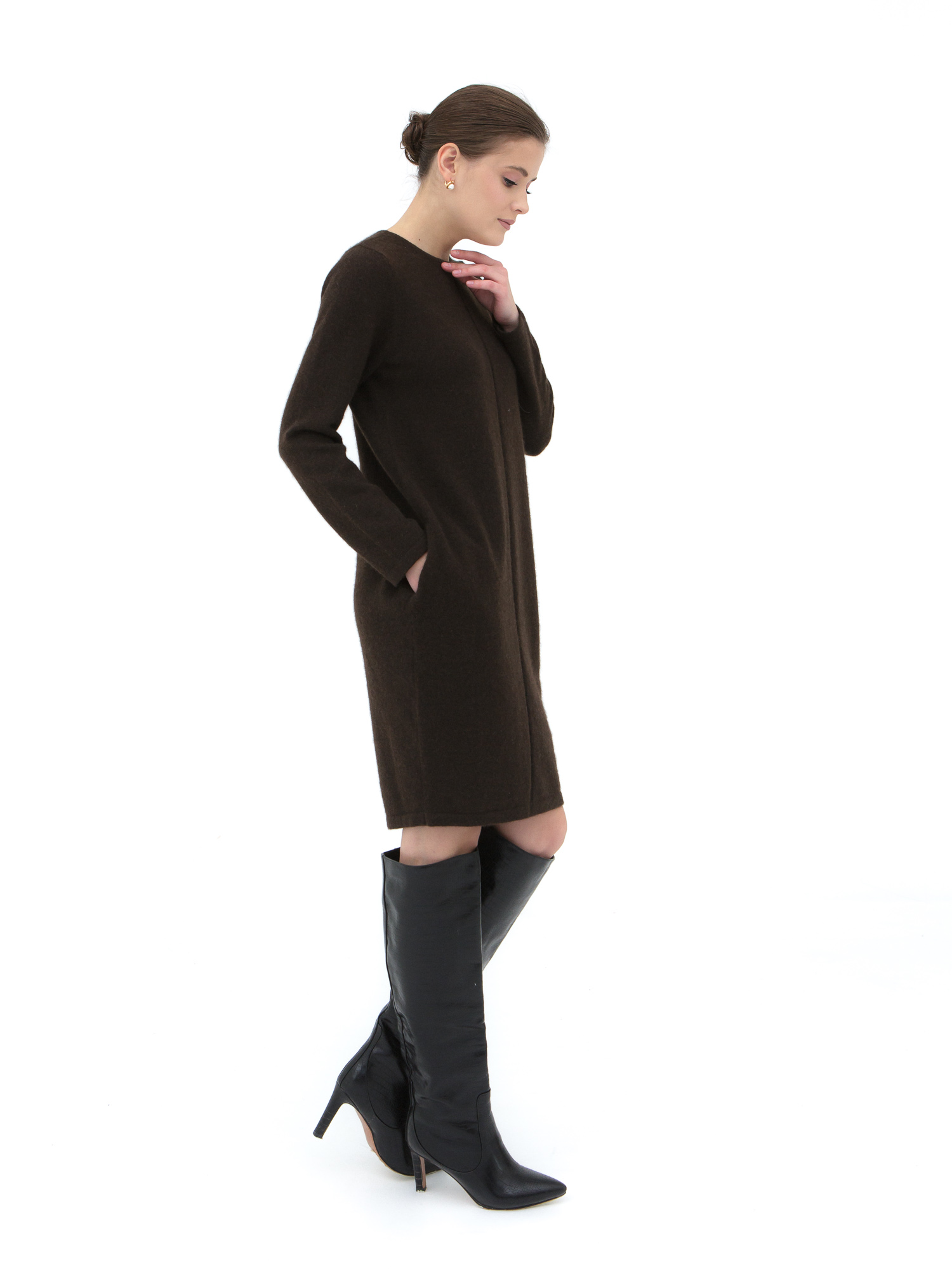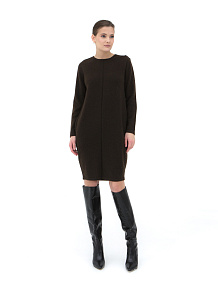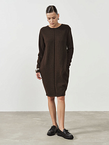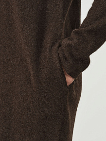 Темно-коричневое платье из пуха яка прямого кроя — это воплощение комфорта и элегантности. Пух яка, из которого изготовлено платье, известен своими теплыми и мягкими свойствами, что делает его идеальным для холодных сезонов. Прямой крой подчеркивает фигуру, создавая стильный и лаконичный образ, а темно-коричневый цвет добавляет изделию универсальности и роскоши.