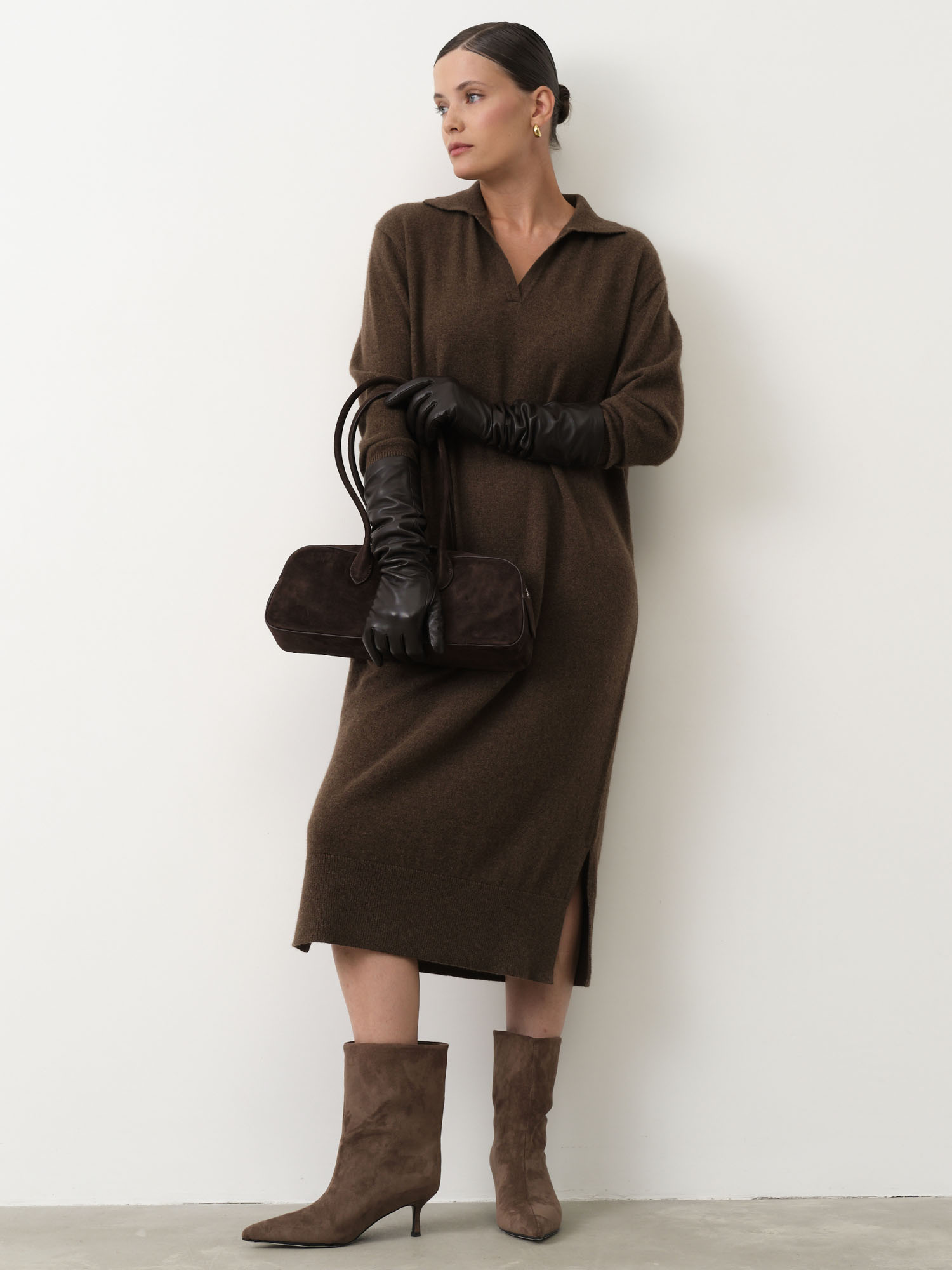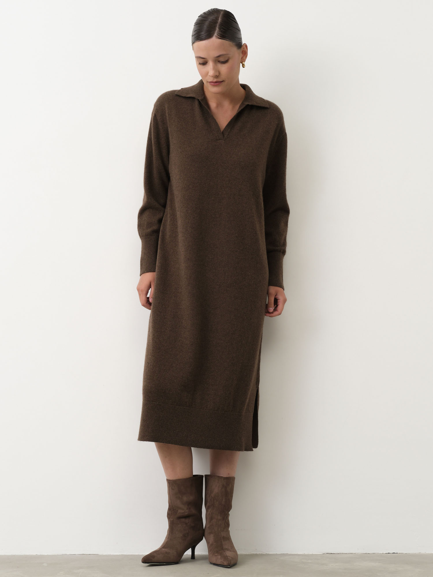 Прямой силуэт миди-длины с аккуратным воротником-поло и боковым разрезом для свободы движений. Лаконичный крой делает модель универсальной и вне времени.