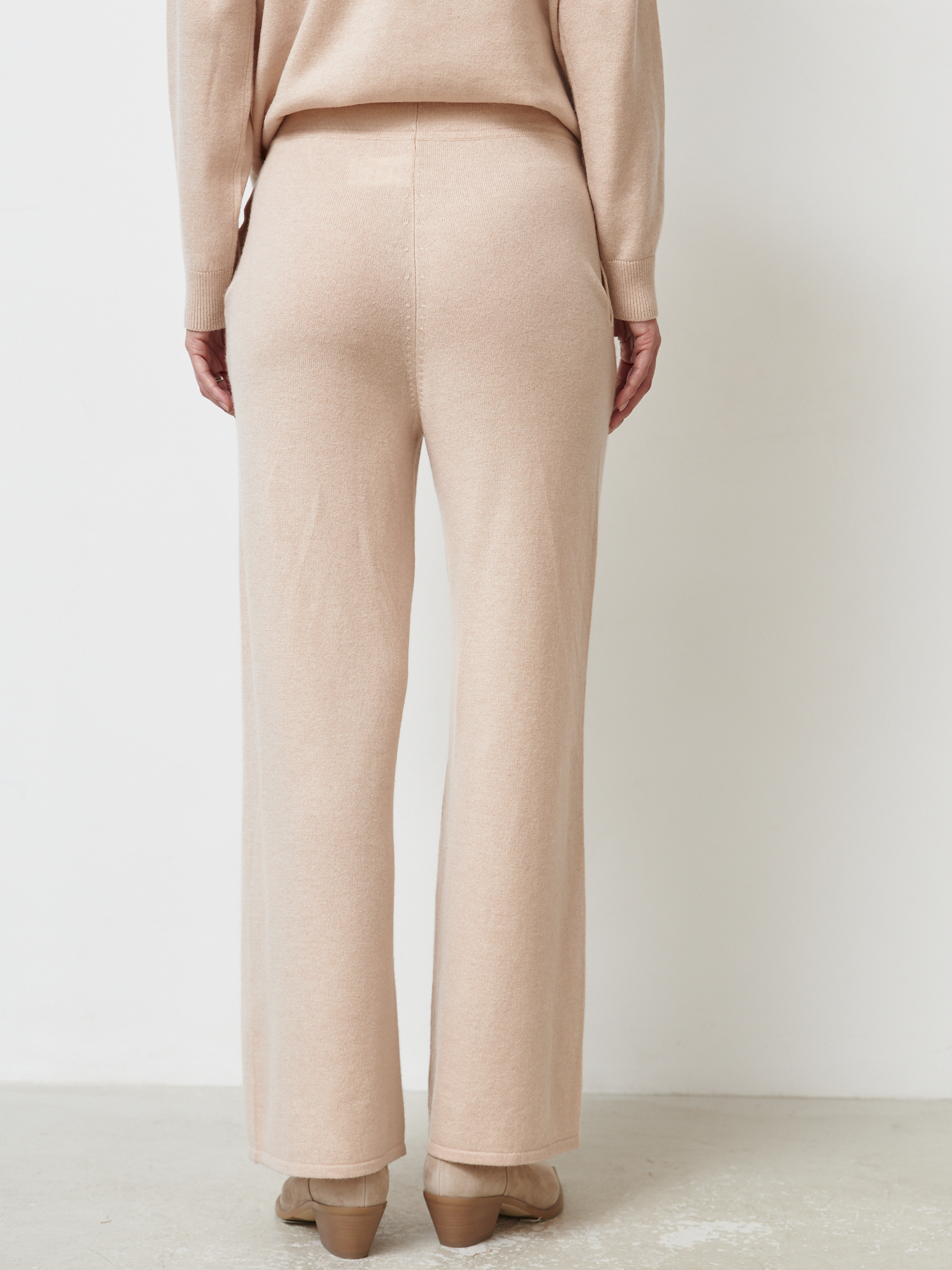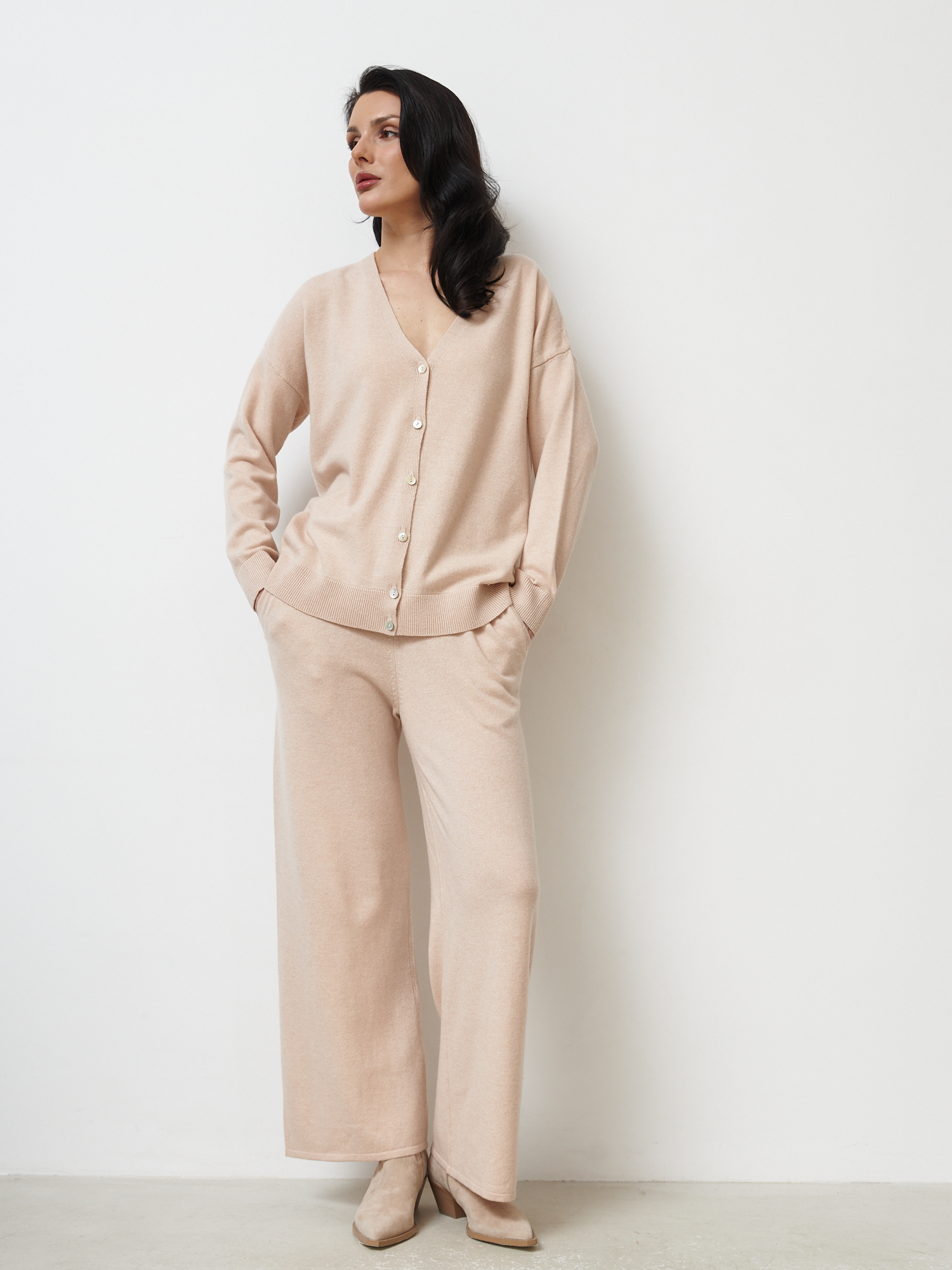 Отлично смотрятся в комплекте с кашемировыми кардиганами, свитерами и топами из той же коллекции, а также с базовой обувью в нейтральных оттенках.